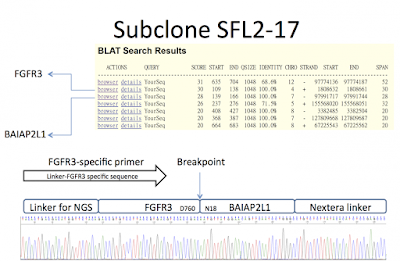 The initial result of my method showed some positive clones. The SFL3 has might have a FGFR3-AREL1 fusion, but I am not sure it is real or false positive cloning. I am repeating this (SFL3) and other 2 samples.