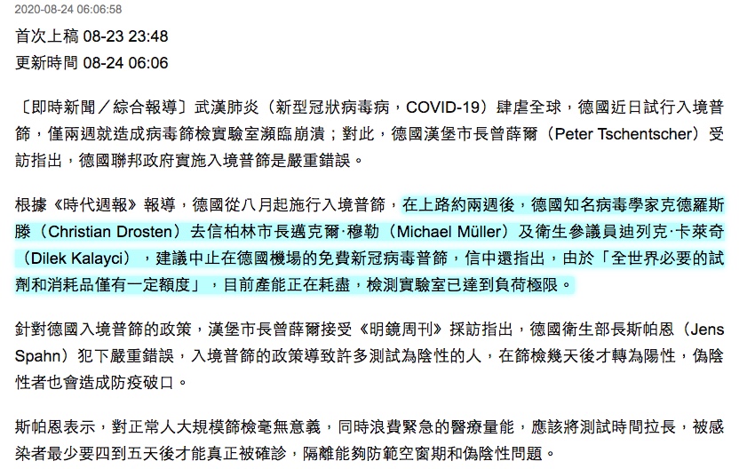武漢肺炎》德國入境普篩兩週已瀕崩潰 漢堡市長:嚴重錯誤 (自由電子報)