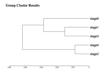 所以,我再囉唆一次,因為看了下面兩個圖後,我把stage 2的資料先不加入分析,因此僅看 stage 0, stage1, stage 3, stage 4的基因變化趨勢,共篩出543個基因,也就是Pathway Book v1中的”mouse model”部份。