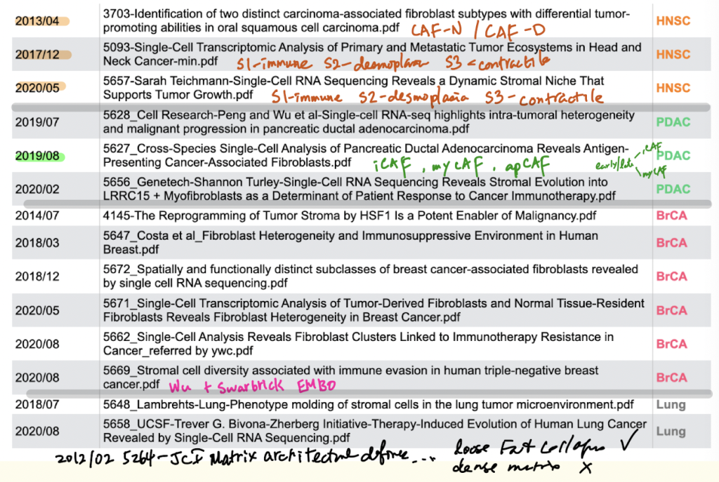 CAFs as a whole 先舉4篇例子: PDAC 2014 (25259922 Sherman), CRC 2015, TBNC 2018, HNC 2020; 再加上 Sahai review (31980749); Miyai (32060987) 提醒versatility 及小心使用
